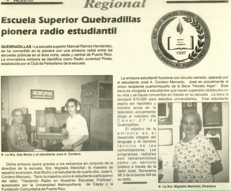 Bajo la administración de Mindy, se le permitió a la profesora Ada Muñiz llevarme a un taller sobre radio en Bayamón. Tanto Ada como este servidor le presentamos la idea de crear Radio Juventud Pirata y, luego de mucho trabajo con otros estudiantes nació la emisora escolar. La trabajadora social Olga Nieves, también nos impulsó en varios proyectos escolares junto a grandes maestros expertos en sus disciplinas. Al mismo tiempo, la orientadora Milagros Prieto me abrió las puertas de su familia y ha sido una figura importante en momentos difíciles en mi vida.